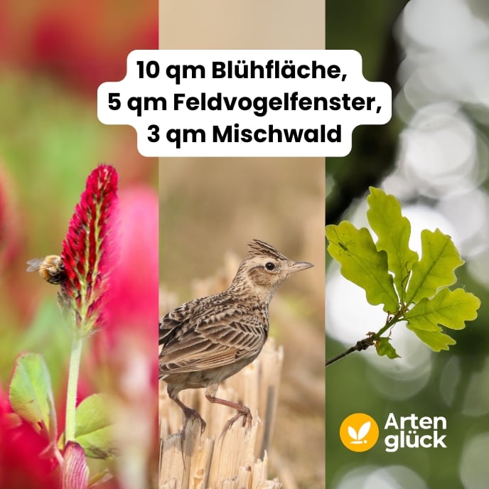 Mit der All-In-Patenschaft kombinierst du gleich drei wirkungsvolle Naturschutzmaßnahmen in einem Paket. Deine Patenschaft umfasst 10 m² Blühfläche, 5 m² Feldvogelfenster und 3 m² Mischwaldaufforstung in Deutschland.